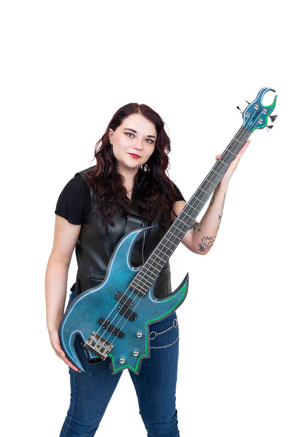 A showstopper bass with a shimmery green-blue finish and a mirrored claw-like lower horn. Cosmic warrior energy.