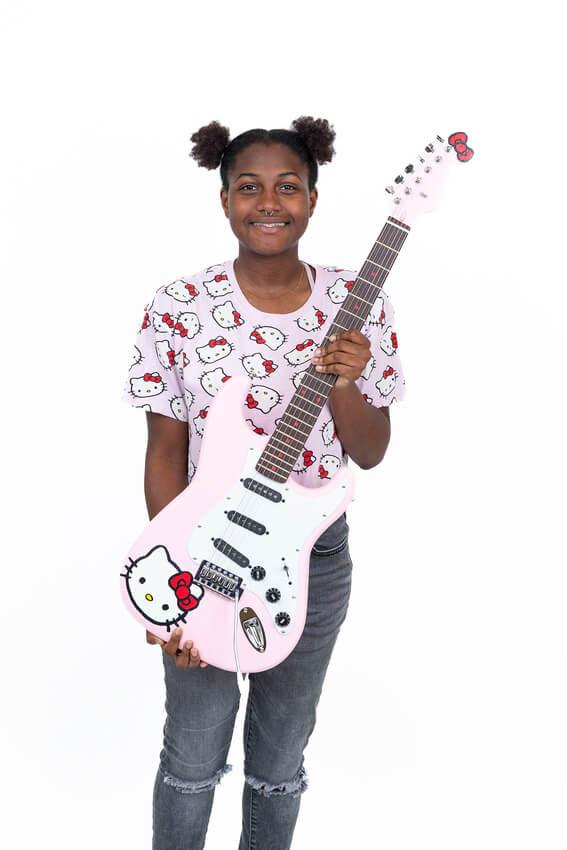 Soft pink with red fretboard dot inlays and a Hello Kitty graphic. Playful, personal, and polished.