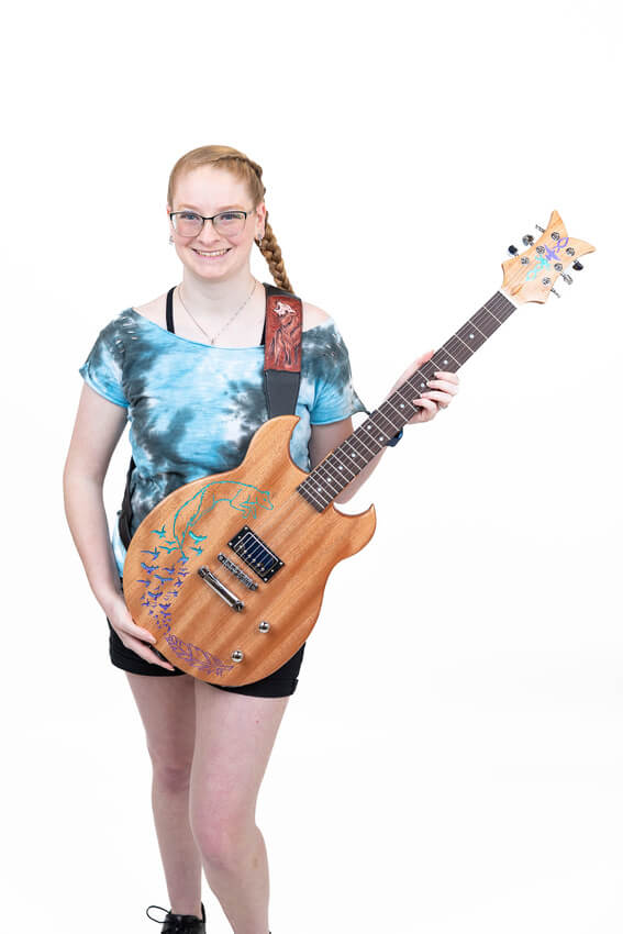 What started as identical blocks of wood became fifteen completely unique instruments. Bold colors. Sculptural body shapes. Classic burst finishes. Hand-painted flames. Laser-cut wings. Each one carried the personality of its maker.